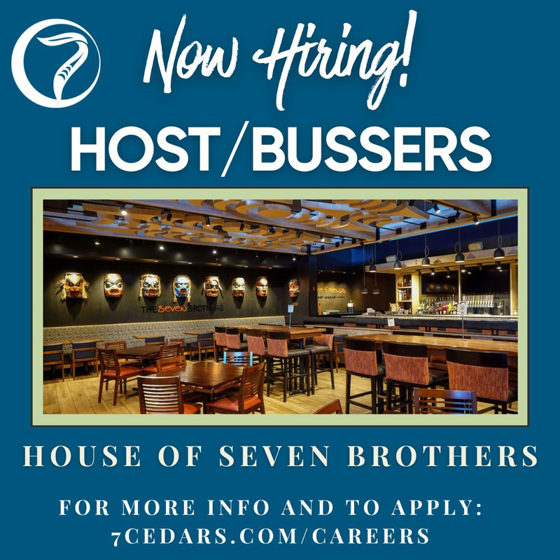 Join the team at House of Seven Brothers located inside 7 Cedars Casino! We're looking for a Host/Busser to help create a welcoming and smooth dining experience for our guests. This is a highly tipped position, offering great earning potential while working in a fun, fast-paced environment. If you enjoy working with people, staying active, and being part of a team---we want to meet you! Apply today and be part of something great at 7 Cedars Casino.