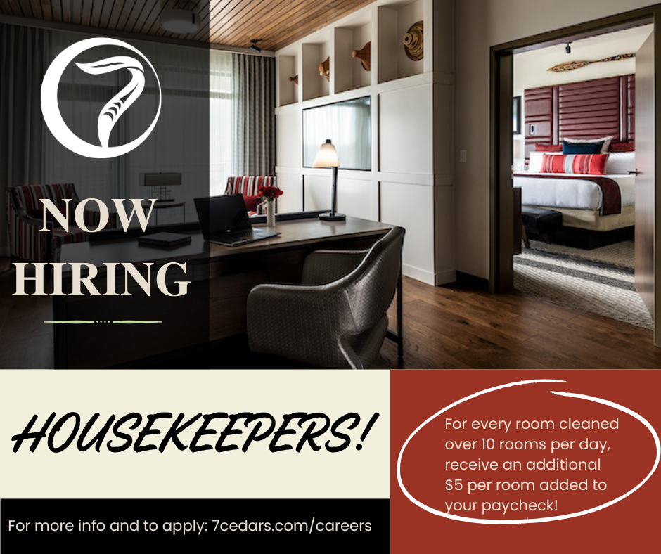 Do you have an eye for detail and take pride in a job well done? Join our housekeeping team and help create a clean, comfortable stay for our guests. Apply today and start your journey with 7 Cedars! Housekeeping is primarily responsible for ensuring cleanliness in the hotel rooms and common areas.